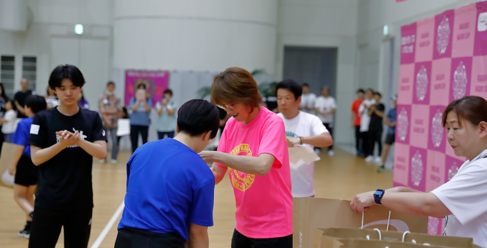 終了後は参加者全員による投票で「ベストスマイル選手」「ベスト応援賞」「全力プレー賞」「ベストスマイル監督」を決定し表彰しました。参加賞としてアシックスジャパン株式より、開催中のよりネイションズリーグ公式グッズから全日本男子チームのクリアファイルが全員に進呈されました。また、アシックスジャパン株式会社より提供されたバッグなどグッズ類はジャンケン大会の勝者に渡されました。
